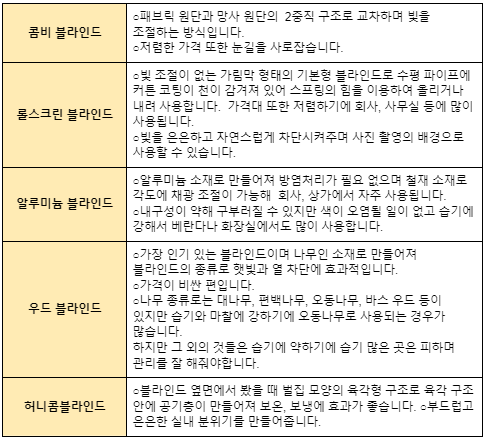 장점 - 종류가 다양하며 빛 조절이 쉽고 깔끔한 느낌을 연출해 줍니다. - 각도에 따라서 빛의 양 조절이 가능합니다. - 세탁하지 않아도 됩니다. 단점 - 창문 사이즈에 정확하게 맞춰야 해서 만약 현재 집에서 다른 집으로 이사했다고 하면 다시 재사용하기가 어렵습니다. - 관리도 어렵습니다.